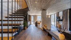 – Exposed concrete ceilings with wood texture, free-floating wooden staircase with noble metal elements and recessed doors