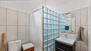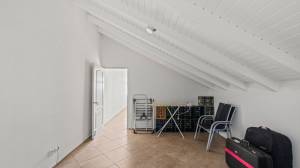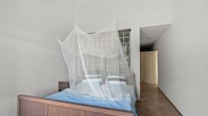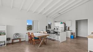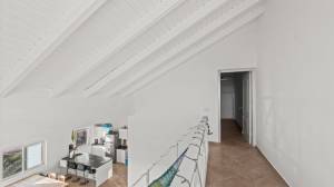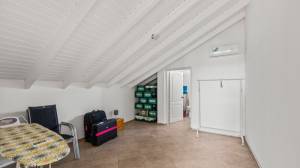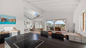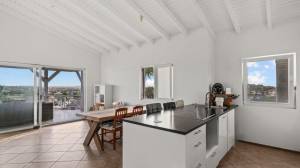 The penthouse is accessed via a staircase on the side of the building. Upon entry, a spacious and bright living room welcomes you with high ceilings that create an airy and open atmosphere. Two sliding doors lead out to a large covered terrace with views of the tropical garden and the sea. At the rear of the living room is a luxurious semi-open kitchen, fully equipped with modern appliances including a combi oven/microwave and a dishwasher. The living room and terrace blend into one large living space when the doors are fully opened — perfect for relaxing or entertaining.