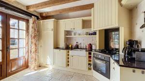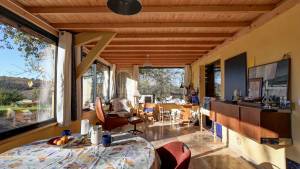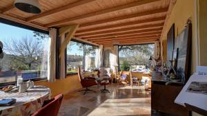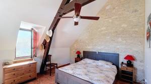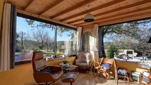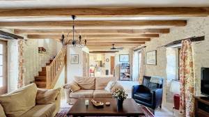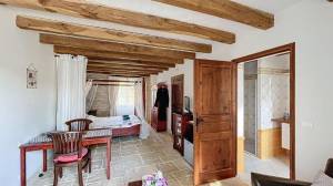 Het hoofdhuis (woonoppervlak ca. 260 m²) heeft op de bovenste verdieping (zwembadniveau, toegang via buitentrap tot groot terras van 42 m²) een mooie woonkamer/eetkamer van ca. 80 m² met houtkachel, op maat gemaakte en volledig uitgeruste open keuken (vernieuwd in 2024) met openslaande deuren naar het terras, twee slaapkamers (12 en 11 m²) en een badkamer. Separaat toilet.