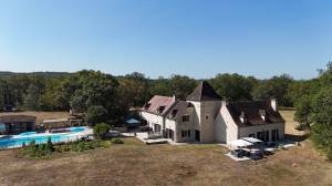 CO-EXCLUSIVITEIT: Schitterend karakteristiek geheel op ruim 13,5 hectare land met weide en bos. Prachtig en beschut gelegen tussen historische steden als Sarlat-la-Canéda en Cahors. Het bestaat uit een ruim natuurstenen landhuis, gastenverblijf/gîte, toren, een schuurtje, een verwarmd zwembad en een poolhouse met buitenkeuken gelegen in een zeer rustige en groene omgeving. Het landhuis is volledig en zeer degelijk gerenoveerd in het jaar 2000. Het is thans een comfortabele woning voorzien van alle gemakken met o.a. centrale vloerverwarming, dubbele beglazing en glasvezel. Gelegen op korte afstand van een gezellig en aantrekkelijk stadje met alle voorzieningen (o.a. restaurants, winkels, treinstation en ziekenhuis) nabij de grens van de departementen Lot en Dordogne. Het geheel heeft een woonoppervlak van in totaal 350 m². Het landgoed wordt bereikt via een landweggetje en een eigen privéweg leidend naar een ruime parkeerplaats. De twee woondelen zijn verbonden middels een ‘pigeonnier’; de duiventoren, en hebben ook een eigen aparte ingang via de buitenzijde.