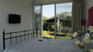 The ground floor comprises four spacious bedrooms, each with its own en-suite bathroom. All bedrooms are fitted with floor-to-ceiling patio doors, allowing for abundant natural light and direct access to the landscaped gardens and pool area, seamlessly connecting indoor and outdoor living. The basement level provides additional storage space, offering practicality for both permanent living and holiday use.
