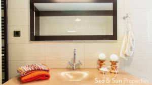 The main entrance is located on the first floor, where a bright open-plan living, dining, and kitchen area creates a welcoming and functional space. This level also includes a guest WC and storage room, while large openings lead out to a balcony with sea views overlooking the pool area, ideal for relaxing or entertaining.
