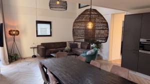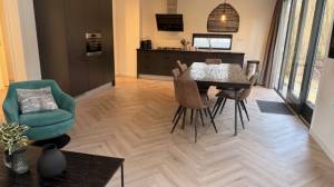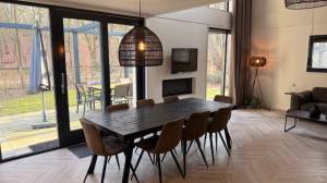 De woonkamer is stijlvol ingericht met een comfortabele loungehoek met grote bank, twee fauteuils, salontafels en een tv (CAI-aansluiting en WiFi aanwezig). De sfeervolle doorkijkhaard vormt het warme middelpunt van de ruimte en zorgt voor extra ambiance.