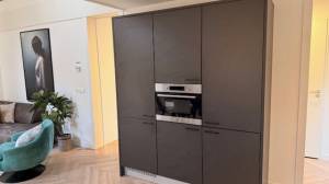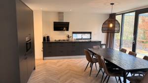 De ruime eethoek met lange tafel en acht stoelen grenst aan de moderne open keuken. Deze keuken is hoogglanzend afgewerkt en volledig uitgerust met een koel-vriescombinatie, combimagnetron, oven, vaatwasser en gasfornuis met afzuigkap – ideaal voor gezellige diners met familie en vrienden.