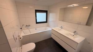 * Badezimmer im Obergeschoss mit Badewanne, WC und Doppelwaschbecken