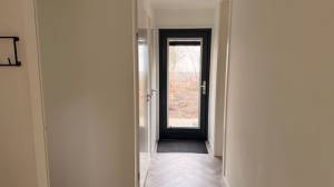Via de hal betreedt u de royale, open woonkamer. Dankzij de grote raampartijen en het hoge plafond voelt de ruimte heerlijk licht en ruim aan. De ramen bieden niet alleen veel daglicht, maar ook een prachtig uitzicht op het omliggende groen.