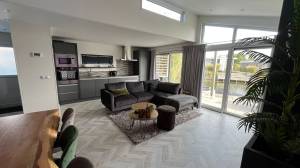 Die Unterkunft verfügt über ein helles und großzügiges offenes Wohnzimmer. Das Wohnzimmer ist mit einer großen Sitzecke, einem Essbereich und einer modernen Küche ausgestattet. Dank der vielen großen Fensterfronten genießen Sie viel Tageslicht und eine herrliche Aussicht über das Wasser. Durch die großen Schiebetüren gelangen Sie direkt auf die Terrasse am Wasser. Die stilvolle Sitzecke ist eingerichtet mit einem großen Ecksofa, zwei Sesseln, zwei kleinen Couchtischen, einem Hocker und einem in die Wand integrierten Fernseher. Der Kamin im Wohnzimmer dient nur zur Dekoration. Der Fernseher empfängt Sender über CAI und in der Unterkunft steht WLAN zur Verfügung.