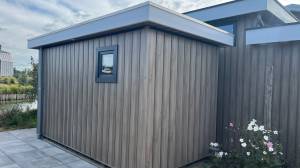 Daarnaast beschikt de woning ook nog over een externe berging. Deze is voorzien van stroom en heeft een wasmachine aansluiting op het riool. Hierin staan nu drie grote stellingkasten. Handig om uw spullen in op te bergen tijdens uw vakantie. Aan de buitenkant van de woning, bij de steiger en bij de schuifpui, zijn extra stopcontacten geïnstalleerd. Zo kunt u ook eventueel uw elektrische boot opladen en volop genieten van het buitenleven.