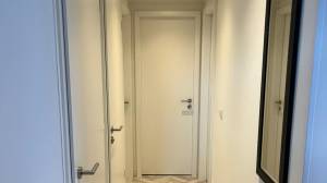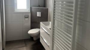 De nette, volledig betegelde badkamer is uitgerust met een douchecabine, toilet, designradiator en wastafel met spiegel. Daarnaast is er een separaat toilet aanwezig.