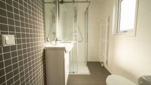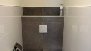 Das gepflegte, vollständig geflieste Badezimmer ist mit einer Duschkabine, einer Toilette, einem Design-Heizkörper sowie einem Waschbecken mit Spiegel ausgestattet. Zusätzlich gibt es eine separate Toilette.