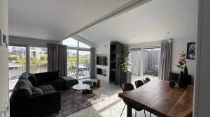 De woning beschikt over een lichte en ruime open living. De living beschikt over een grote zithoek, een eethoek en een moderne keuken. Dankzij de vele grote raampartijen geniet u van volop natuurlijk licht en een schitterend uitzicht over het water. Door de grote schuifdeuren heeft u een makkelijke verbinden naar uw terras aan het water. De stijlvolle zithoek is ingericht met een grote hoekbank, twee fauteuils, een tweetal kleine salontafels, een poef en een tv ingebouwd in de muur. De haard in de woonkamer, is voor de sier. De tv ontvangt zenders via CAI en er is WiFi aanwezig in de woning.