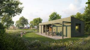 Het resort zelf is ontworpen als een groene oase waarin duurzaamheid en comfort samenkomen. De 80 accommodaties zijn landschappelijk ingepast en omringd door wadi’s, bloemenvelden en een voedselbos. Wateropvang, biodiversiteit en natuurlijke beplanting zijn integraal onderdeel van het ontwerp. Bij aankomst parkeer je onder een solar carport en wandel je via groene paden naar je lodge. De opzet is ruim en natuurlijk, waardoor rust en privacy centraal staan. Goldberg Gardens Eco-resort Vorden is geen traditioneel vakantiepark, maar een duurzaam eco-resort waarin architectuur, landschap en exploitatie samenkomen in één doordacht concept.