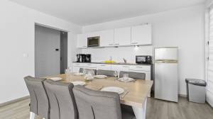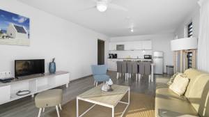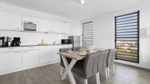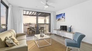 Das helle, geräumige Wohnzimmer geht nahtlos in eine voll ausgestattete offene Küche über und bietet direkten Zugang zu einer großen, teilweise überdachten Terrasse – der perfekte Ort, um laue Abende, eine erfrischende Brise und spektakuläre Sonnenuntergänge zu genießen.