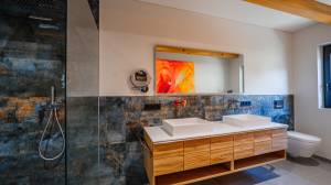 THE PONDHOUSE – "Privéleven aan het water" – dit buitengewone huis combineert op unieke wijze rust, licht en panoramisch uitzicht.Het pand ligt aan het einde van een privé toegangsweg aan de rand van het bos in de wijk Ramseiden in Saalfelden en biedt een fantastisch, ononderbroken panoramisch uitzicht op het Steinerne Meer, de Kitzsteinhorn en de toppen van het Leogangebergte. De ruime natuurlijke zwemvijver in de tuin is veel meer dan alleen een designhoogtepunt: het wordt het middelpunt van het leven in en rond het huis en creëert een heel speciale feelgood-sfeer.Met een woonoppervlakte van ongeveer 260 m² combineert het huis openheid met een aangenaam toevluchtsoord. Royale glasoppervlakken, hoogwaardige materialen en een heldere kamerindeling creëren een lichtdoorstroomde, rustige woonsfeer. De entree biedt een stijlvolle entree met een op maat gemaakte garderobe met geïntegreerde zitgelegenheid en vormt de opmaat naar de rustige begane grond.Op de begane grond is er een slaapkamer en een aparte kleedkamer, die er direct aan grenst. Er is nog een kamer naast die flexibel kan worden gebruikt als extra kleedruimte, bergruimte of individuele opbergruimte. Een andere slaapkamer op dit niveau is uitgerust met een eigen badkamer, douche en toilet en biedt een afgelegen, comfortabel toevluchtsoord. De ruimte wordt gecompleteerd door een extra ruime berging en een aparte bijkeuken.Een ander deel van de begane grond biedt veel ruimte voor individuele ideeën. Twee open, met elkaar verbonden ruimtes zijn al voorbereid, zodat hier met weinig moeite een privé wellnessruimte kan worden gerealiseerd. Er is een aparte douche en wc en er is een aansluiting voor een sauna voorbereid. De directe toegang tot de zwemvijver via een buitentrap is bijzonder harmonieus – perfect voor iedereen die een combinatie van warmte, water en natuur wil.De bovenverdieping wordt overspoeld met licht en biedt een royale hoeveelheid ruimte. Een lichte hal met ramen van vloer tot plafond verbindt de woon- en slaapgedeeltes en plaatst stijlvolle accenten met een verlichte roestvrijstalen plantenbak en een groot buitenraam met een kunstzinnig geënsceneerd wolfsobject van drijfhout. Blootliggende houten balken op de hele bovenverdieping geven het huis zijn alpine karakter en stralen een warme, natuurlijke gezelligheid uit.De grote woonkamer met open haard vormt het middelpunt van het huis. Binnen zorgt de open haard bekleed met leren tegels met dierenprint voor een moderne gezelligheid, terwijl het uitzicht door de grote raamelementen van vloer tot plafond je het gevoel geeft dat je midden in de natuur zit.De open keuken met kookeiland met hoogwaardige Miele-apparatuur, Quooker en natuursteenplaten van Strasser verenigen een hoogwaardige combinatie van tijdloze elegantie en maximaal wooncomfort. De praktische glazen schuifelementen bieden directe toegang tot het terras van ongeveer 50 m², waardoor de binnen- en buitenruimtes bijna naadloos in elkaar overgaan.Op de bovenverdieping wachten nog twee slaapkamers op je, elk met een eigen badkamer. De hoofdslaapkamer is een hoogtepunt op zich: deze maakt indruk met een vrijstaand bad en een direct aangrenzende, ruime badkamer, die je verwent met een luxe regen- en watervaldouche. De aparte doucheruimte voor de gasten maakt de verdieping compleet. Alle slaapkamers hebben externe rolluiken en vliegenhorren. Een apart gastentoilet maakt dit niveau compleet.De buitenruimtes passen harmonieus bij de ligging op een heuvel. Natuurstenen trappen, stenen muren en veelhoekige oppervlakken leiden naar de ruime natuurlijke zwemvijver met een lengte van ongeveer 20 meter en een diepte tot 2,70 meter. De aanlegsteiger en verschillende ligweiden maken het tot een privéverblijf aan het water. Een voorbereide aansluiting voor een whirlpool maakt het wellnessaanbod in de tuin nog groter.Het geheel wordt afgerond door een ruime oprit met carport inclusief elektrisch oplaadpunt en extra buitenparkeerplaatsen. De stenen gevel benadrukt het hoogwaardige, natuurlijke karakter van het huis. Qua technologie beschikt het pand over een luchtwarmtepomp, vloerverwarming in alle kamers, viervoudig beglaasde Internorm ramen van hout-aluminium met elektrische rolluiken en vliegenhorren, evenals hoogwaardig beslag van Mafi, Villeroy & Boch, Voglauer en Keuco.Het chalet, oorspronkelijk gebouwd in houtbouw op de bovenverdieping in 2003, werd uitgebreid gerenoveerd en volledig thermisch vernieuwd in 2021. THE PONDHOUSE combineert alpine authenticiteit, moderne architectuur en uitzonderlijke levenskwaliteit – een toevluchtsoord aan het water voor mensen die houden van rust, licht en panoramisch uitzicht van het hoogste kaliber.Dit huis ligt in Saalfelden am Steinernen Meer, in de gewilde wijk Ramseiden, een van de rustigste en aantrekkelijkste woonwijken in de regio. De omgeving wordt gekenmerkt door goed onderhouden woongebouwen, ruime groenzones en de onmiddellijke nabijheid van het bos – een ideale omgeving voor ontspannen wonen dicht bij de natuur.Als economisch, educatief en cultureel centrum van de regio Pinzgau biedt Saalfelden een uitstekende infrastructuur. Het stadscentrum is binnen een paar minuten te bereiken en heeft talrijke winkelmogelijkheden, restaurants en cafés, artsen, apotheken, scholen en kleuterscholen. Het treinstation met directe verbindingen naar Salzburg, Innsbruck en Zell am See zorgt ook voor een uitstekende regionale en nationale bereikbaarheid.De wijk Ramseiden maakt indruk met zijn rustige woonsfeer en uitstekende vervoersverbindingen. Wandel- en fietspaden, hardlooproutes en natuurlijke recreatiegebieden beginnen direct voor de deur. Voor sport- en natuurliefhebbers biedt de regio een breed scala aan recreatieve activiteiten in elk seizoen – van wandelen, mountainbiken en golfen in de zomer tot langlaufen en alpineskiën in de winter.Verschillende bekende skigebieden zoals Leogang-Saalbach-Hinterglemm, Maria Alm en Zell am See-Kaprun liggen op slechts een klein