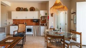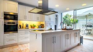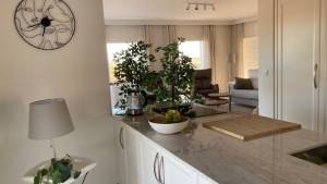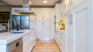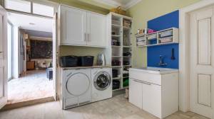 Het hart van het huis is de royale eetkeuken, uitgerust met hoogwaardige Miele-apparatuur, waaronder een inductiekookplaat. Deze keuken komt direct uit op het zonnige terras, waar een ingebouwde grill het buiten koken gemakkelijk en plezierig maakt. Vlakbij bevindt zich de complete wasruimte, die zowel praktisch als elegant is, met op maat gemaakte opbergkasten, een opklapbare tafel en een Miele-wasmachine en -droger.